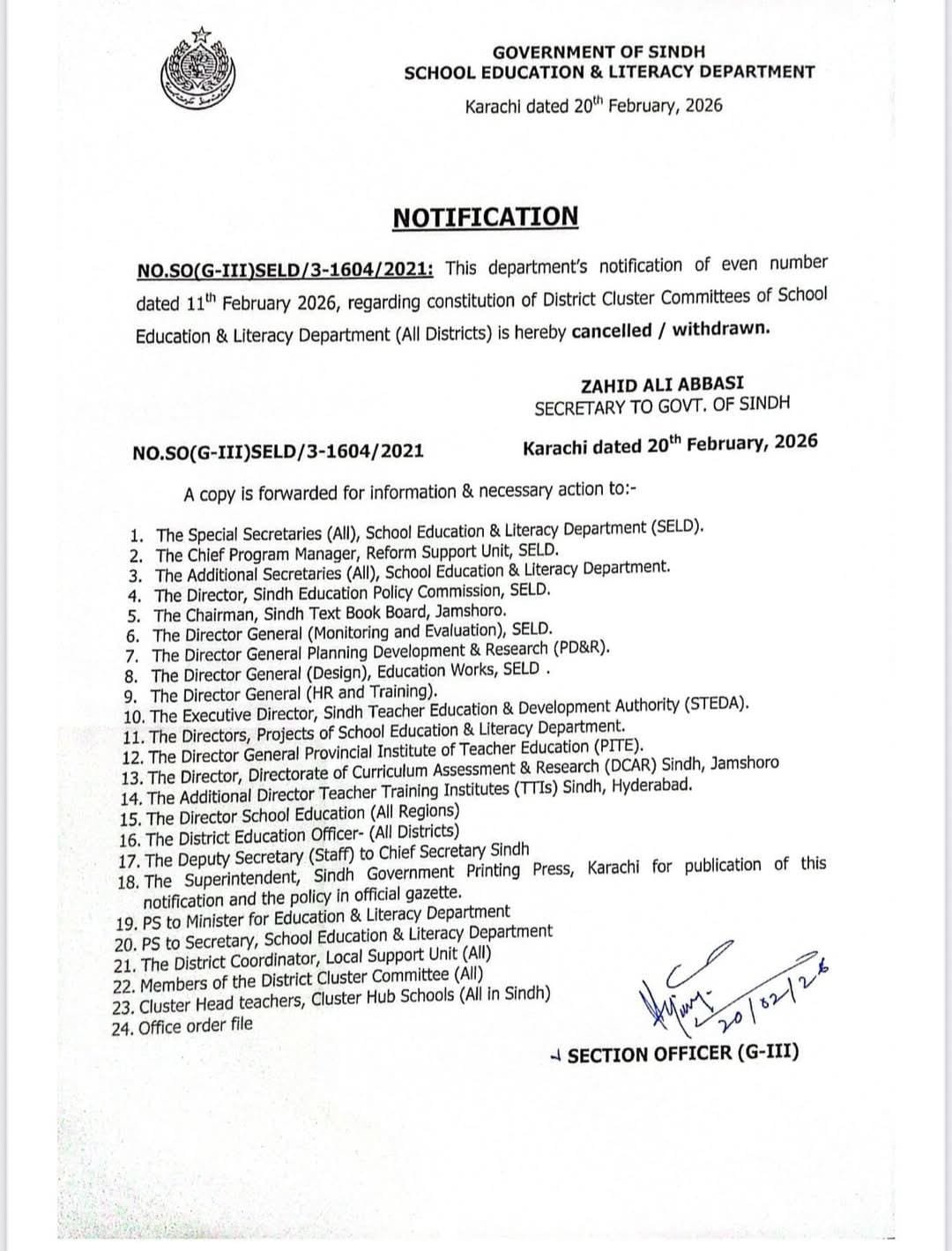 Karachi, February 21, 2026: The Sindh School Education and Literacy Department has officially withdrawn its February 11, 2026 notification regarding…