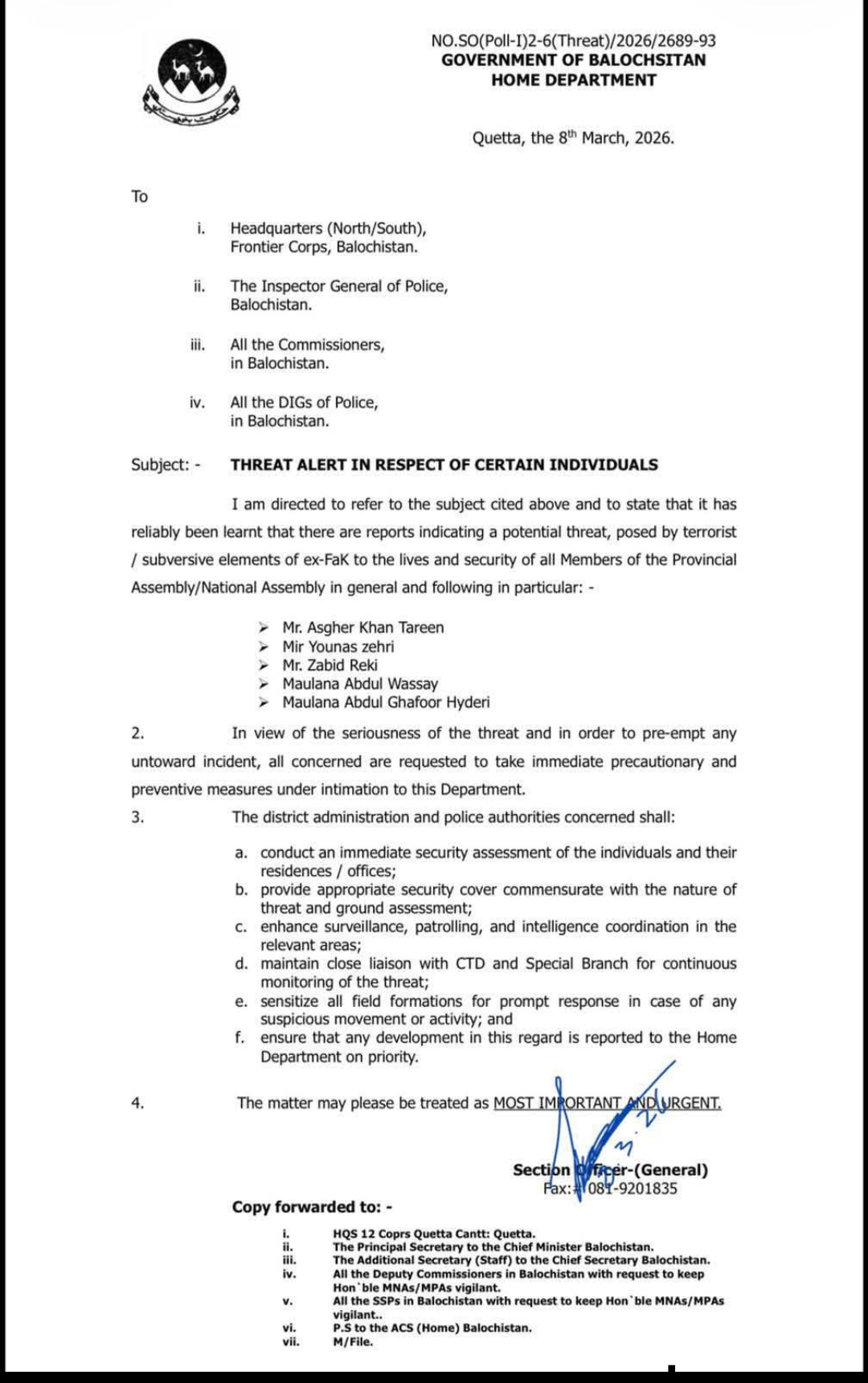 Quetta: The Government of Balochistan Home Department has issued a security threat alert for several political leaders, directing law enforcement…